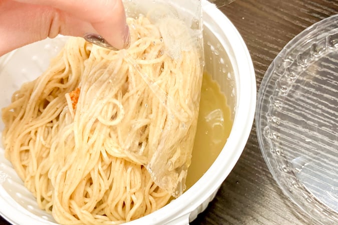 ② 麺の下に敷いてあるビニールのフィルムを外す