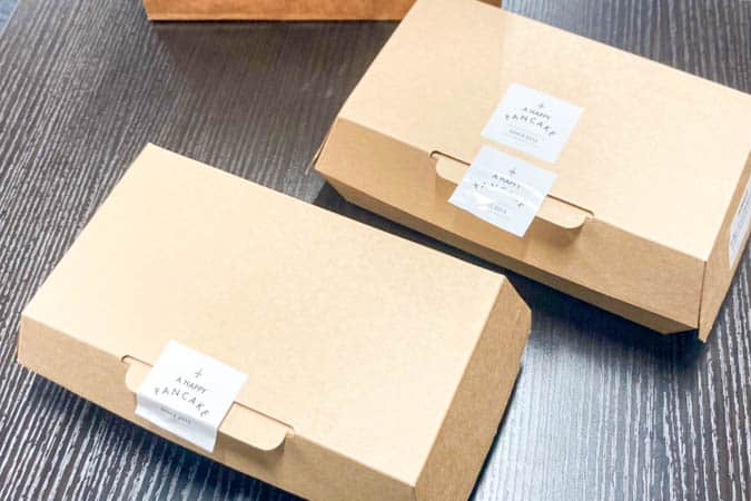 届いた紙袋の中には紙のボックスが2つ。パンケーキと、トッピング3種とで分かれています。