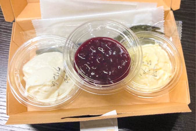 ホイップバターとチーズムースは固めで、プラカップからすくってきれいにトッピングするのが難しかった…(だがしかし、おいしいのでオッケー)