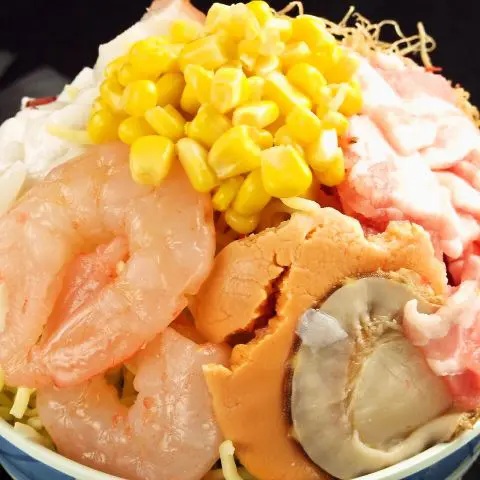 イカ、タコ、エビ、ホタテ、豚肉、コーンに麺と、とにかく具だくさんなもんじゃです。