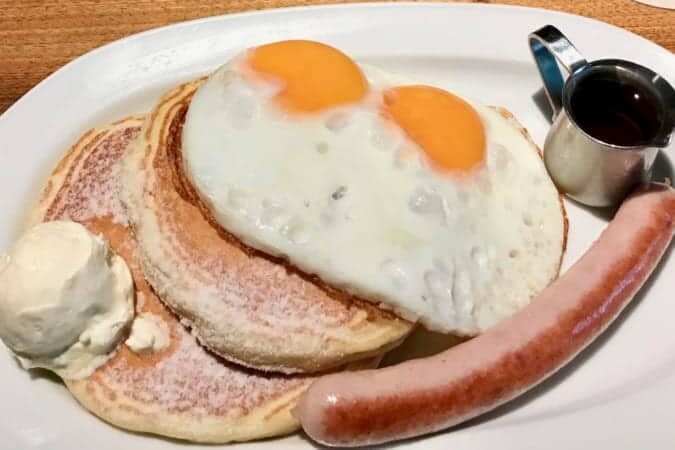 こちらは、8:00~10:45(L.O.)に注文できるBREAKFASTメニューの「バターミルクパンケーキ ソーセージ、フライドエッグ 2,080円(税込)」。