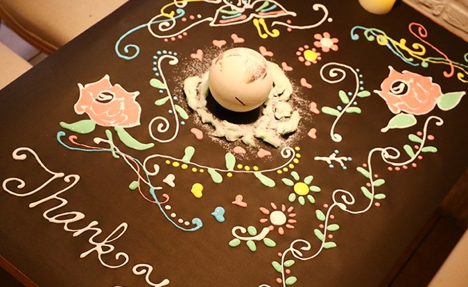 テーブルを丸ごと一枚のお皿に見立てて、店員さんがデザートをアーティスティックに盛り付けしてくれます♪