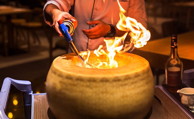 目の前で店員さんが炎によってチーズを絡めながら作ってくれる演出は、動画撮影マストです!!