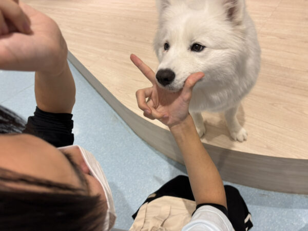 おやつを手にした瞬間、視界が真っ白に!ワラワラとサモエドたちが集まってきて、人生最大のモテ期を体験できます。おやつは手のひらに乗せて一粒ずつ……と思っても、乗せた瞬間に吸い込まれていきます(笑)。スタッフさんが優しく「着席」の指示を出してサポートしてくれるので、落ち着いてあげることもできました。